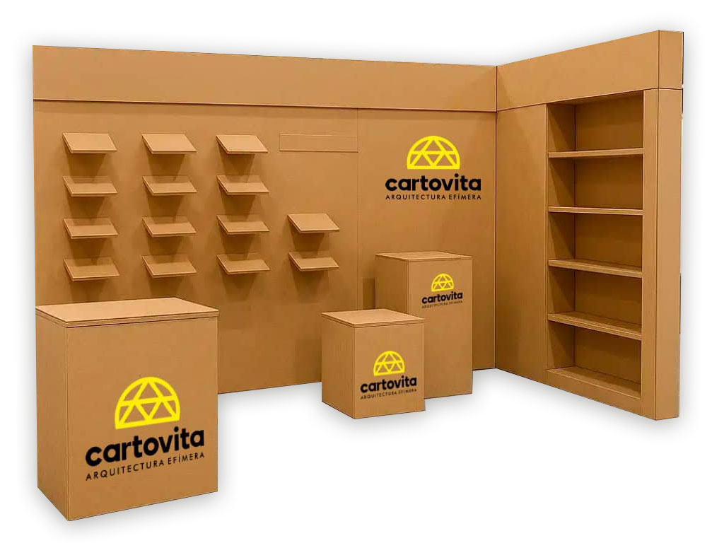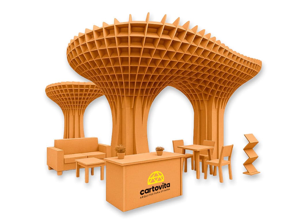 Creatividad, sostenibilidad y diseño se unen para dar forma a estructuras únicas hechas en cartón. Stands, mobiliario y escenografía creados con materiales 100% reciclables.